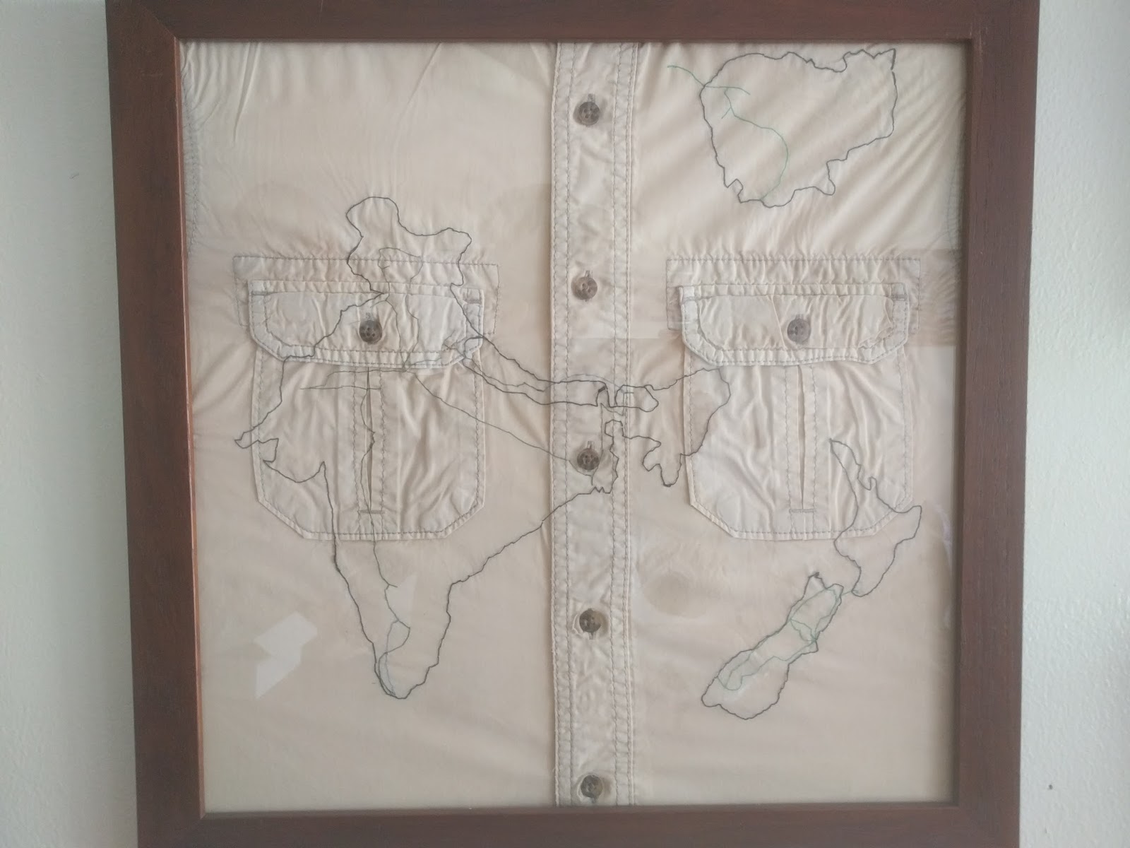 Each time, I brought one button-down shirt. They tended to be khaki-colored, which is partially just coincidence and partially because I want to be Indiana Jones. Each time, by the end of the trip, after I wore it for 50+ days, that shirt was pretty beat up. For some reason, I still saved them. And here’s why: I had this idea to stitch the routes I took onto them. Finally I got around to doing it.